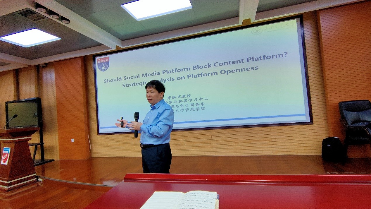 2021年4月20日,西安交通大学管理公司廖貅武教授应邀来作题为《Should Social Media Platform Block Third-party Content Platform? A Strategic Analysis on Platform Openness》的学术报告,并与师生交流大数据管理与应用专业建设心得。公司伟德国际1946研究生及部分教师听取了学术报告。
