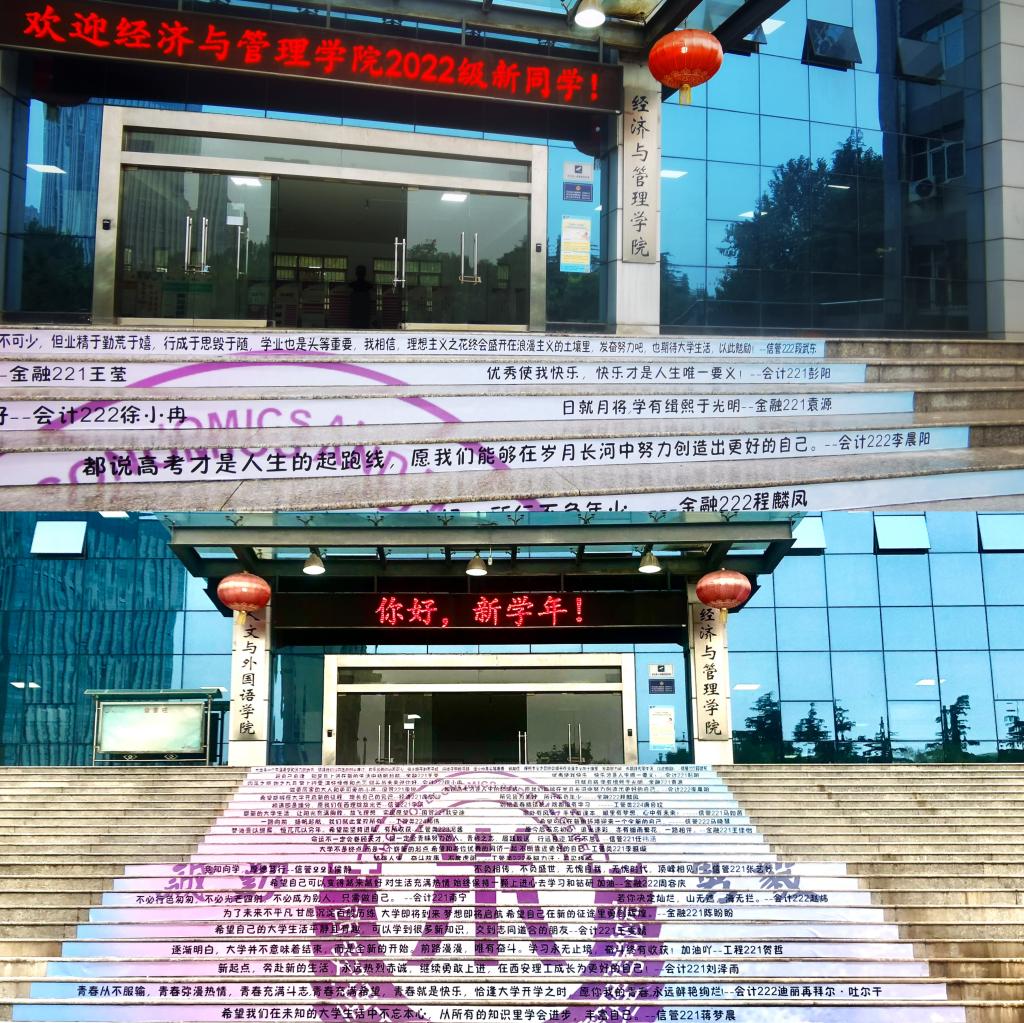布置迎新站点,让新生充满“归属感”。为全力做好新生接待工作,公司在暑期时启动新生礼包征集策划工作,将爱院荣院教育和专业教育相结合,集思广益,最终形成“公司文化+专业教育”迎新主题。在公司正门口,以公司LOGO和四十余位新生的入学寄语组成的贴纸,布满整个楼梯,吸引新生纷纷打卡拍照;以院风院训组成的“诚勤勇毅”印章,激励广大学子诚实守信,勤奋好学,勇于创新,坚毅果敢;存有《国富论》、《资本论》等电子书籍和学习资料的定制U盘也在员工的支持下送到了各位学子手中,勉励学子扎根专业学习;“心怀不惧方能翱翔天际”,由2021级全体学长学姐书写的“时光明信片”如期送至新生学子手中,发挥朋辈作用,引领员工成长;印有习近平总书记寄语的定制手账本契合公司财务管理专业内容,同时也时刻提醒员工科学理财,树立正确的理财观念。