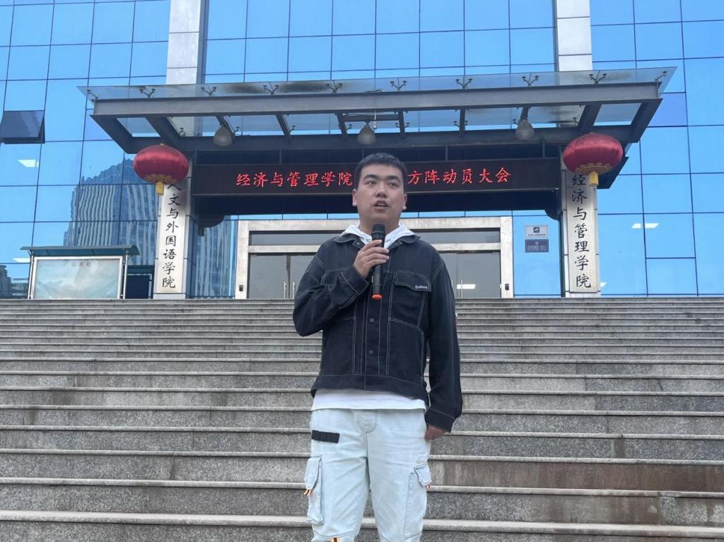 任程宇和杨沛锦依次面向全体方阵志愿者进行动员讲话。他们分别从展现青春风貌、发扬体育精神、保障个人安全三个方面向与会同学提出要求。此次运动会是阔别两年的一次盛会,是展现经管学子良好精神面貌的平台,希望同学们充分发扬不畏困难、永不言败的精神,在保证安全的情况下,继续保持以往公司在运动会中的精神面貌,在展现出经管公司的水平和风采。