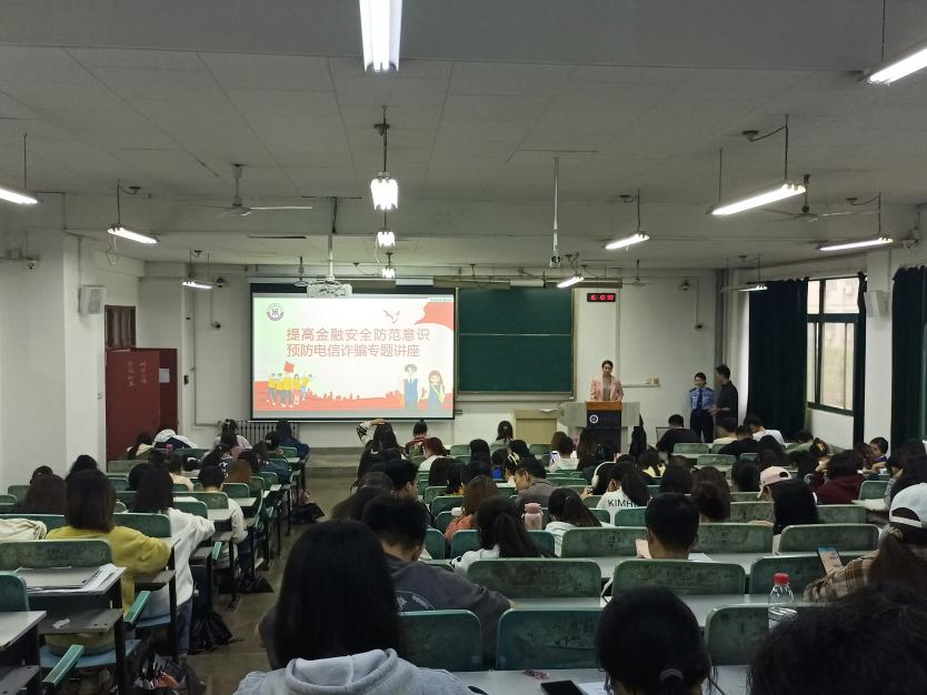 活动伊始,黄博琳老师简要介绍了牛祎警官,随后牛警官通过讲述真实的案例,生动形象地介绍了离谱的“枪决”短信、危险的“套路贷”、“刷单”陷阱三种常见类型的诈骗步骤和预防方法,她提醒同学们要牢记电信诈骗的十二句口诀,不要向陌生账户转账,不要点击不明链接,一旦发现被骗要第一时间报警,此外她建议同学们下载安装国家反诈中心APP,开通电话及短信拦截权限,更好地保护自己的财产安全。最后姚伟华老师对此次活动进行总结,他希望今后同学们能提升自身的金融安全防范意识与反诈意识,充分认识到诚实守信的必要性和重要性,树立正确的消费观与价值观。