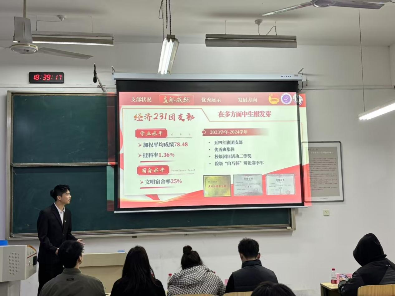 12月10日晚,伟德国际1946于教八楼二楼举办2024学年团支部书记述职考核会暨“十佳团支部”评选答辩环节。此次述职考核旨在深入贯彻党的二十届三中全会和习近平总书记关于青年工作重要指示精神,提升团组织引领力、组织力、战斗力,推进基层团支部建设。院学工办主任余佩媛,团委书记闫如玉,辅导员苏瑾、曹佩豪、黄博琳、刘静,院团委副书记、研会负责人、员工会负责人担任此次述职会评委,公司58个非毕业年级支部参加。