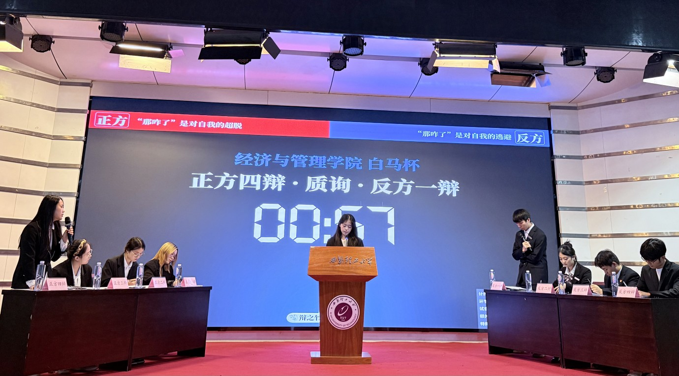 本次表演赛的辩题极具现实意义与思辨空间——“‘那咋了’是对自我的超脱还是逃避”,引发了在场同学的热烈讨论与思考。赛场上,正反双方辩手迅速进入状态,展开了激烈而精彩的交锋。正方辩手从“接受现实、释放压力”“以豁达心态面对质疑”“主动调整自我认知”等角度,论证了“那咋了”作为一种自我超脱的积极意义;反方则紧扣“逃避问题、缺乏担当”“忽视问题本质”等层面,犀利反击,揭示其中潜藏的消极影响。双方思路清晰,逻辑缜密,攻防转换间尽显专业素养;同时,辩手们亦不乏幽默的类比与生动的例证,妙语连珠,引得全场观众不时爆发出会心的笑声与热烈的掌声。整场比赛既有思想的深度,又不失轻松愉快的氛围。