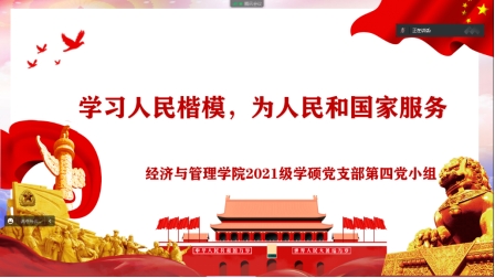 为加强支部党员的奉献意识与担当情怀,进一步激发党支部为国家和社会做贡献的活力,11月25日,2021级学硕党支部在线上开展了“学习人民楷模,为人民和国家服务”专题学习会。会议由段家兴主持,支部党员及入党积极分子参加此次会议。