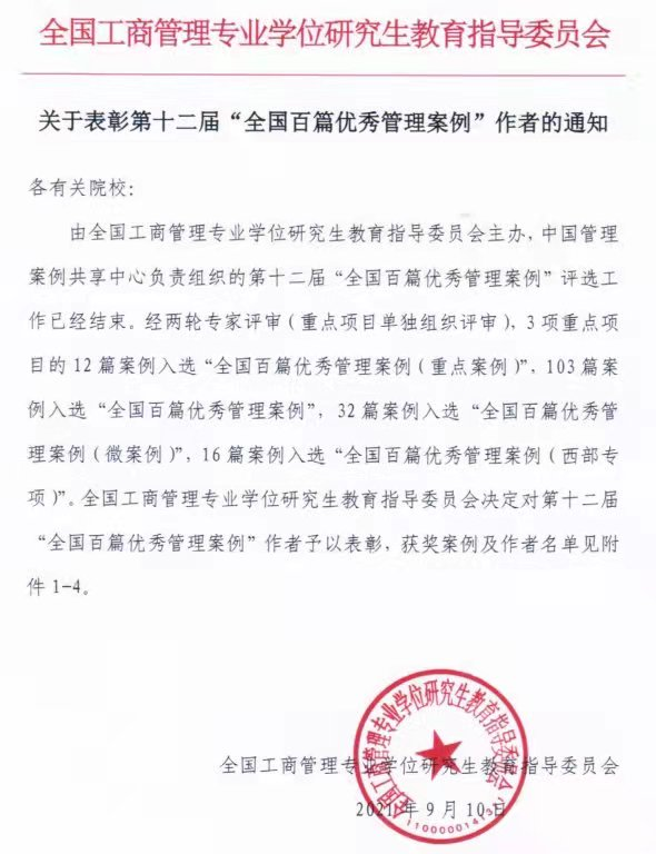 9月10日,全国工商管理专业学位研究生教育指导委员会发布了第十二届“全国百篇优秀管理案例”(简称“百优案例”)入选名单,并对获奖院校及作者予以通报表彰。公司伟德国际1946蒋晓荣副教授及其团队撰写的案例在激烈竞争中脱颖而出,成功入选第十二届“全国百篇优秀管理案例”(西部专项)。这是蒋晓荣副教授及其团队继入选第十届“全国百篇优秀管理案例”(西部专项)后的再次入选。这次入选标志着公司伟德国际1946在管理案例研究与开发工作的持续进步,有力地推动公司一流本科和研究生教学及团队建设。