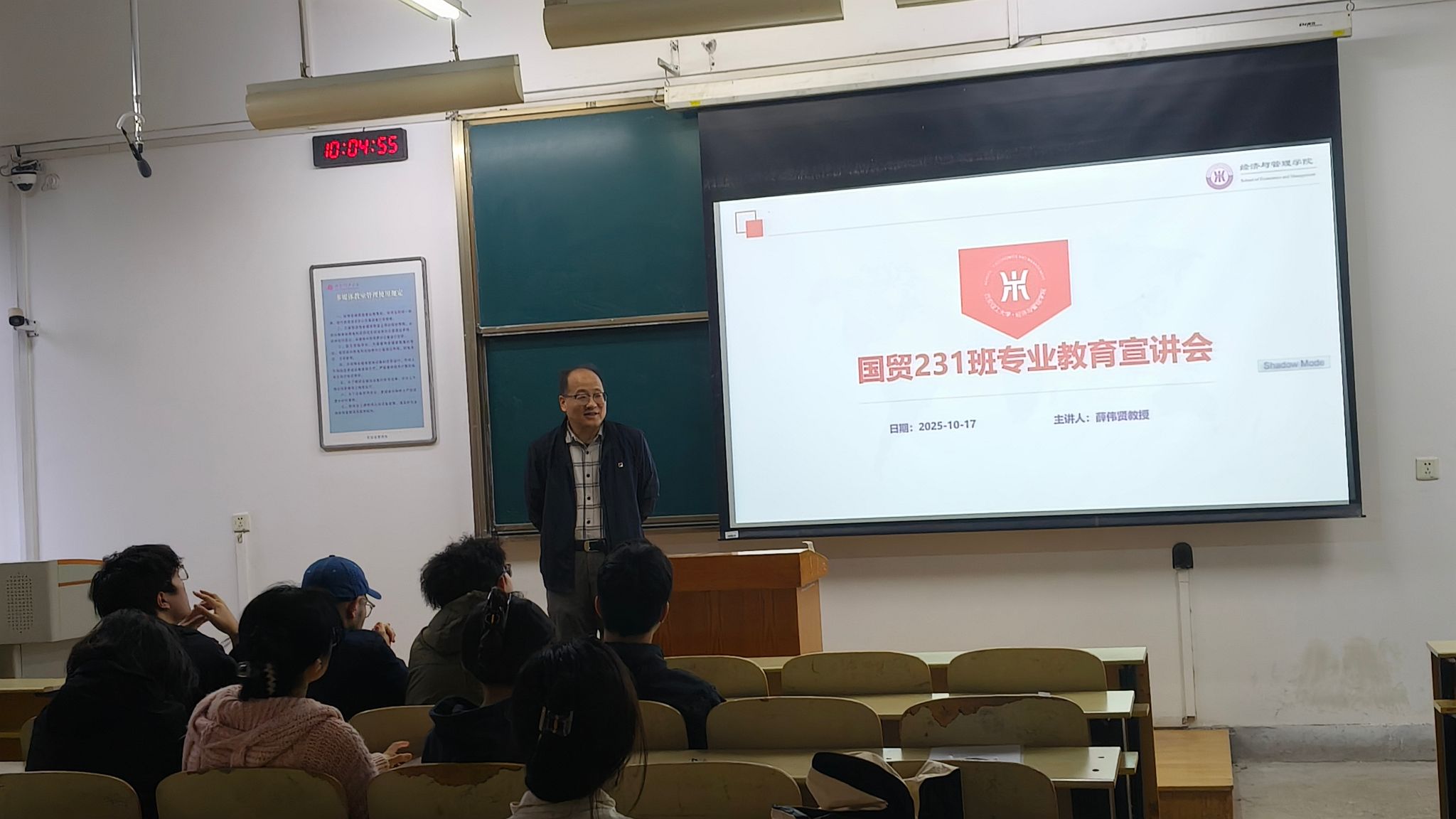 10月17日上午,首场讲座面向2023级国际经济与贸易专业员工举行。活动特邀薛伟贤教授(二级教授、博士生导师)开展了题为“国际经济与贸易专业介绍与前景分析”的专题报告。薛伟贤教授首先从“一带一路”倡议、双循环发展格局、气候变化与低碳经济等宏观背景出发,深入剖析了国际经济与贸易专业面临的机遇与挑战,强调了具备国际视野的重要性。随后,薛老师系统阐释了国际贸易模式与利益分配机制,明确了专业培养目标与职业导向,指出优秀国贸人才不仅需要具备扎实的理论知识,还需具备良好沟通能力、外语水平、平台运营与计算机技能等复合能力。最后,薛老师梳理了相关的职业证书与提升路径,鼓励同学们主动规划、积极实践,增强就业竞争力。