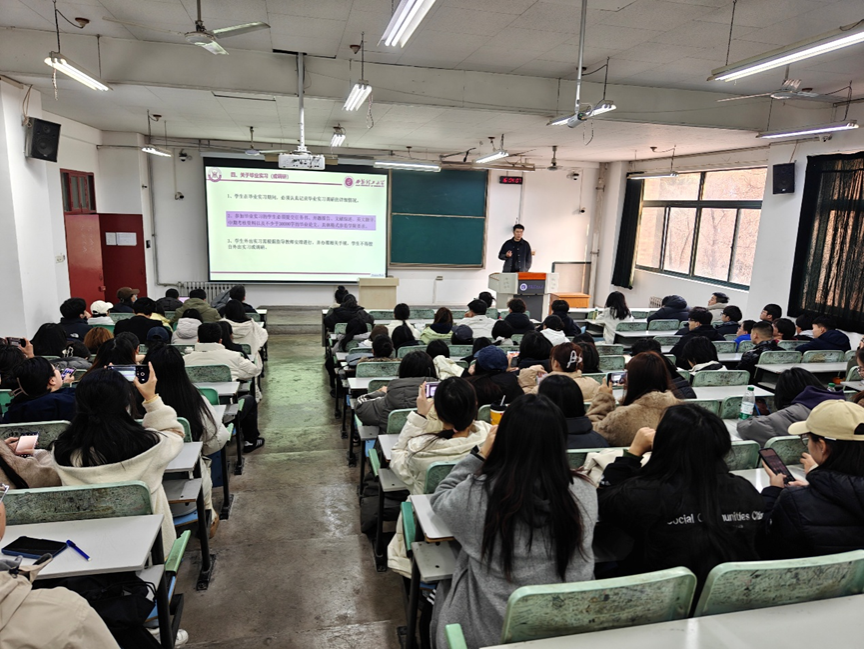 随后,李礼旭副主任结合系里统一安排,系统介绍了本届毕业设计的总体情况与时间进度安排。他重点说明了毕业设计的基本流程、阶段性任务及关键节点要求,从选题与任务书下达、开题报告撰写、中期检查、论文撰写修改到最终答辩,逐一做出明确说明,并强调毕业设计全过程实行“统一管理、分级组织、指导教师负责制”。他特别提醒同学们要主动与指导教师保持高频沟通,合理规划时间,确保每一阶段工作按质按量完成。